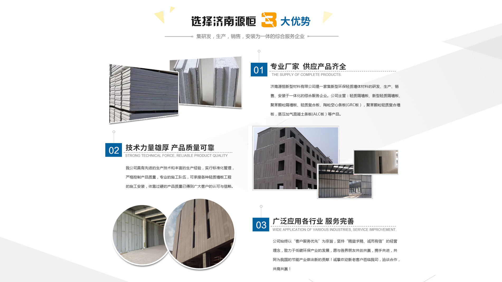 濟南源恒新型材料有限公司坐落于美麗的泉城濟南,是集新型環(huán)保輕質(zhì)墻體材料的研發(fā)、生產(chǎn)、銷售、安裝于一體化的綜合服務(wù)企業(yè)。我公司具有的生產(chǎn)技術(shù)和豐富的生產(chǎn)經(jīng)驗,為您提供輕質(zhì)隔墻板、新型輕質(zhì)隔墻板、聚苯顆粒隔墻板、輕質(zhì)復(fù)合板、陶??招臈l板(GRC板),聚苯顆粒輕質(zhì)復(fù)合墻板,蒸壓加氣混凝土條板(ALC板)等產(chǎn)品,本公司有專的施工隊伍,可承接各種輕質(zhì)墻板工程的施工安裝。輕質(zhì)隔墻板是國家推廣使用的新型輕質(zhì)、綠色無害建材,是墻改節(jié)能政策大力扶持的環(huán)保節(jié)能產(chǎn)品,是發(fā)達國家普遍采用的新型墻體材料。濟南源恒新型材料有限公司實行標準化管理,嚴格控制產(chǎn)品質(zhì)量,依靠過硬的產(chǎn)品質(zhì)量已得到廣大客戶的認可與信賴。公司產(chǎn)品遍布各大城市,與國內(nèi)多家客戶建立了良好的合作關(guān)系。公司始終以“客戶服務(wù)優(yōu)先”為宗旨,堅持“精益求精、誠而有信”的經(jīng)營理念,致力于低碳環(huán)保產(chǎn)業(yè)的發(fā)展,愿與各界朋友共創(chuàng)共贏,攜手共進,共同為我國的節(jié)能產(chǎn)業(yè)做出新的...